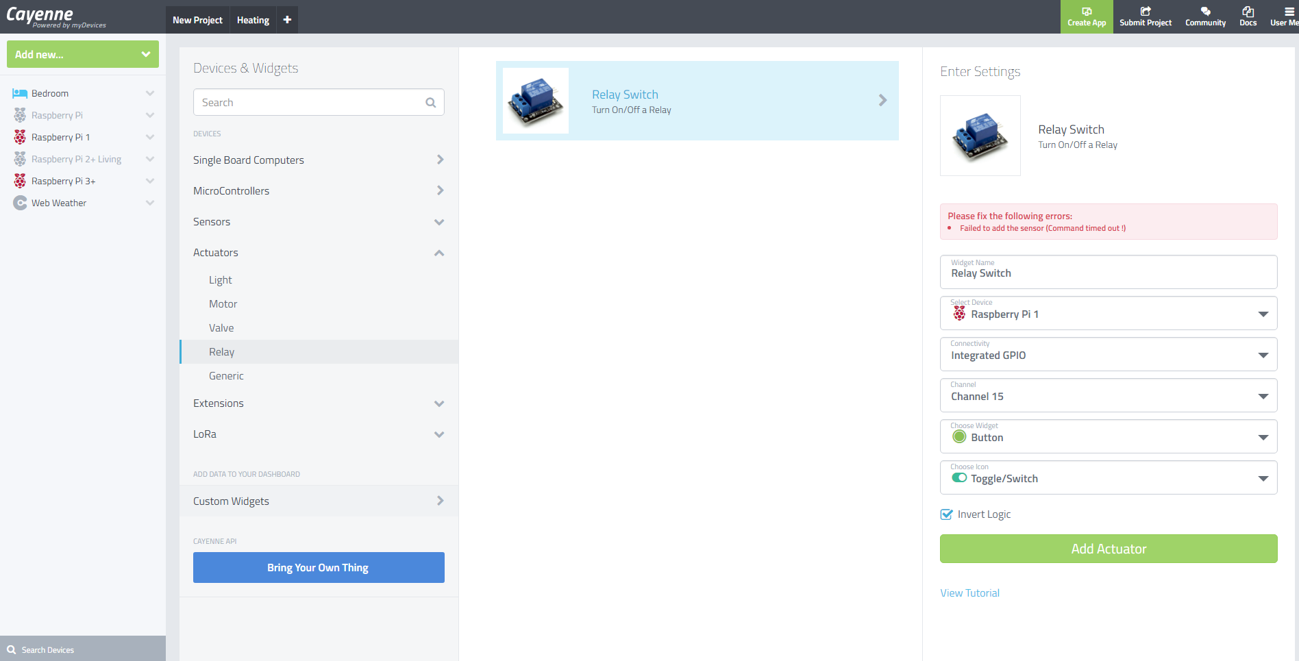 the actuator add command is received by the pi agent and it creates a widgets on the dashboard. the issue is with the dashboard end.